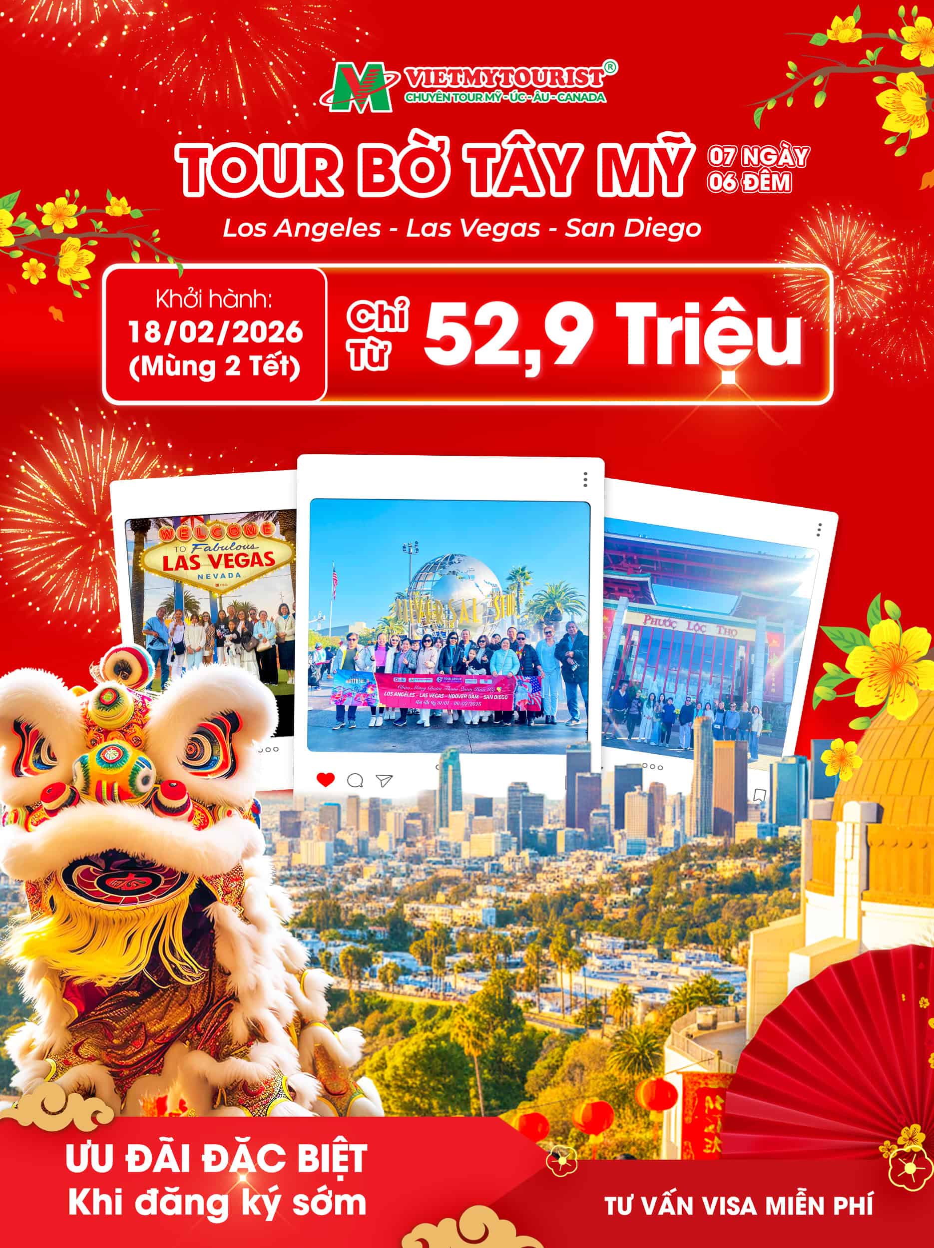 Du Xuân ở Mỹ tháng 2, bạn sẽ được hòa mình vào không khí Tết Âm Lịch ấm áp và rực rỡ sắc màu. Cùng Việt Mỹ Tourist khám phá hành trình 7 ngày 6 đêm tại Bờ Tây nước Mỹ qua các thành phố sôi động: Los Angeles, Las Vegas, San Diego và Đập thủy điện Hoover.