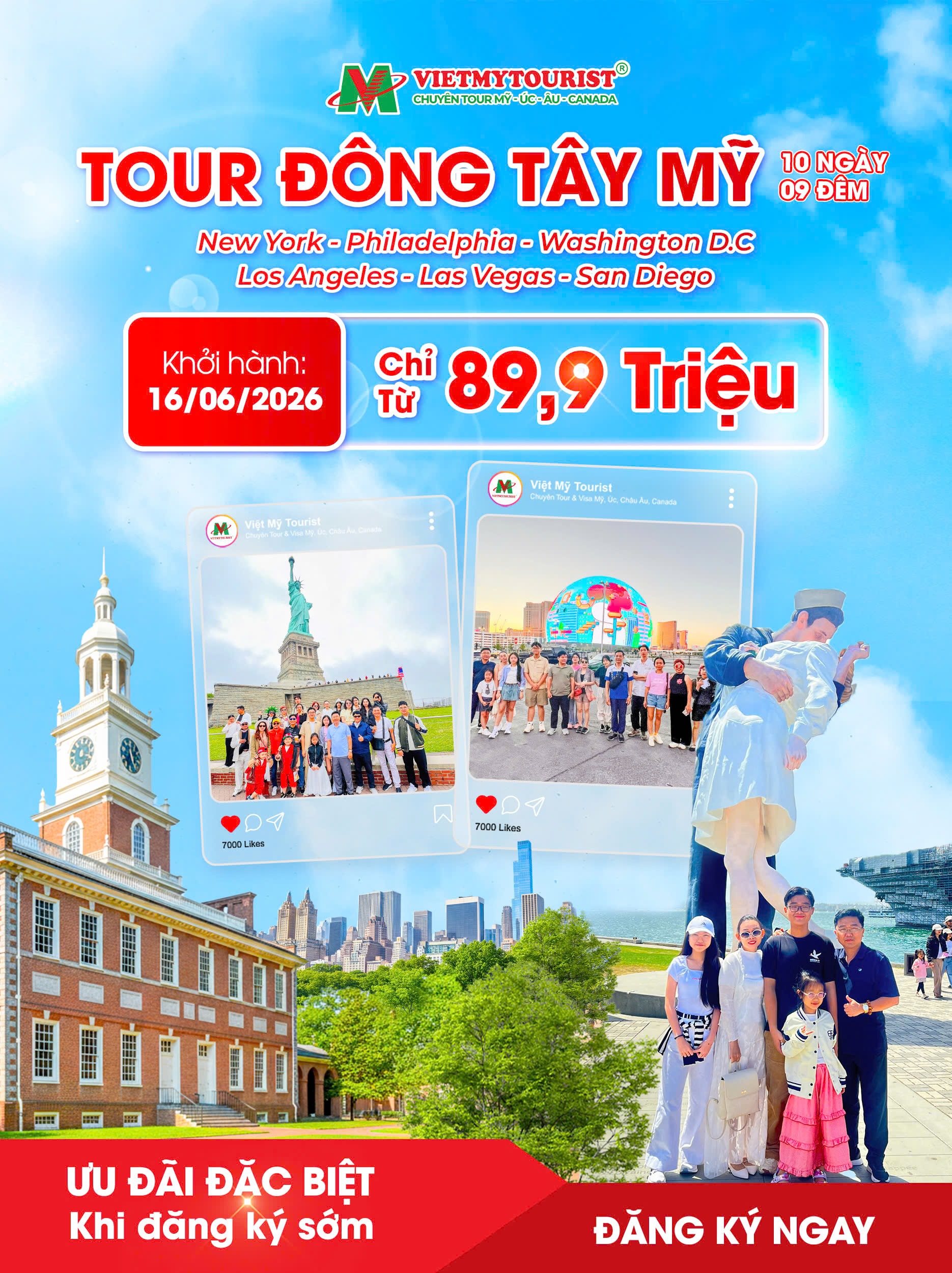 Tháng 6 – Mùa hè rực rỡ trên đất Mỹ! Tour Mỹ Đông Tây 10N9Đ đưa Quý khách qua hành trình tràn đầy năng lượng – từ New York sôi động, Washington D.C. lịch lãm đến Las Vegas rực rỡ ánh đèn – tận hưởng trọn vẹn mùa hè nước Mỹ với niềm vui, trải nghiệm và cảm xúc khó quên