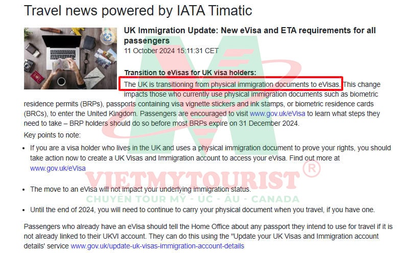 Ngày 9/11/2024, Vương quốc Anh đã công bố một bước tiến mới trong chính sách thị thực: chính thức chuyển đổi từ visa dán truyền thống sang visa điện tử (eVisa). Thay đổi này không chỉ áp dụng cho visa du lịch mà còn bao gồm thẻ cư trú sinh trắc học (BRP), tem dán visa và các nhãn thị thực khác, nhằm tạo điều kiện thuận lợi cho người nhập cảnh, đồng thời nâng cao tính an toàn và bảo mật.